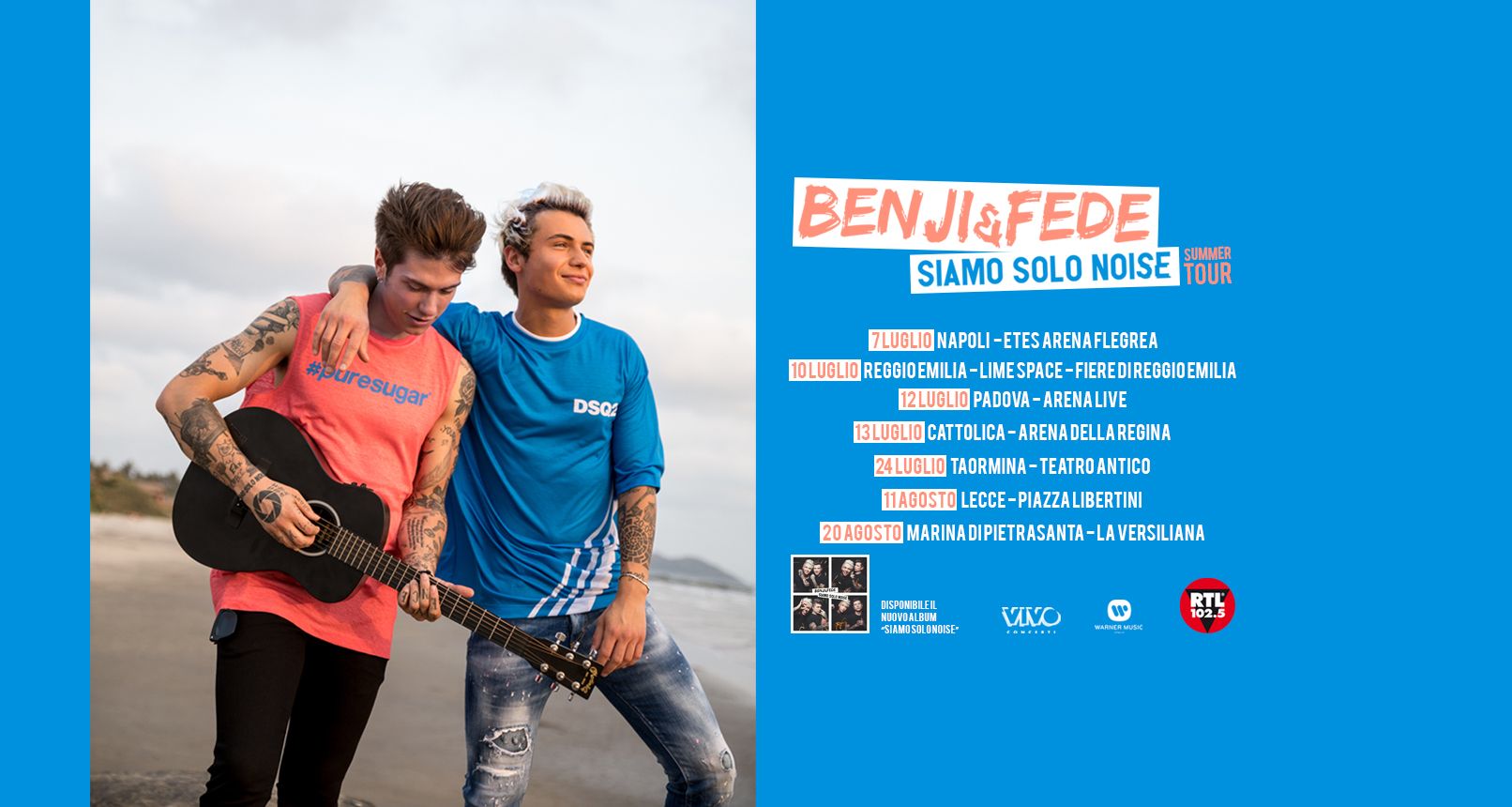 Dopo aver raggiungo il DISCO di PLATINO per il loro nuovo album “Siamo Solo Noise” che ha esordito al n.1 della classifica di vendita ottenendo la certificazione ORO in una settimana, Benji & Fede porteranno le loro nuove canzoni nel “Siamo Solo Noise Summer Tour”, la prima parte del loro tour che toccherà suggestive location estive.