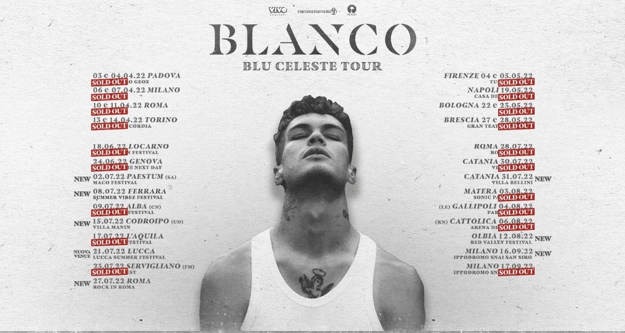 A seguito dell’incredibile sold out di tutte le date annunciate a oggi, e a poche ore dalla certificazione del disco di Platino per Brividi (brano vincitore di Sanremo 2022 insieme a Mahmood), arrivata dopo meno di due settimane dalla pubblicazione, Blanco aggiunge nuovi appuntamenti estivi del BLU CELESTE TOUR tra cui il raddoppio delle date di Roma, Catania e Milano. L’appuntamento a Lucca del 21 luglio cambia inoltre location e si sposta al Lucca Summer Festival - Mura Del Castello.