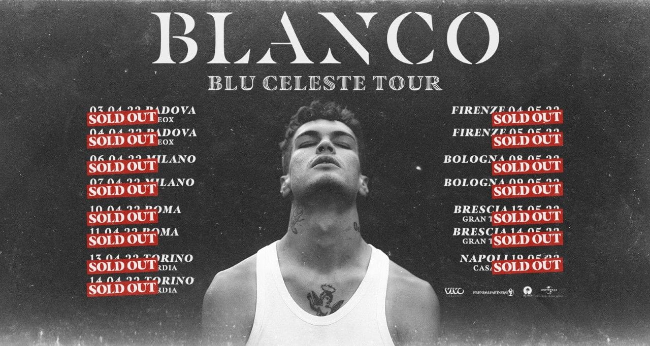Polverizzati in poche ore i biglietti delle date di Blu Celeste Tour, la prima tournée di Blanco: sono già Sold Out tutti gli appuntamenti - le date annunciate e quelle aggiunte oggi - che, a partire da domenica 3 aprile 2022, porteranno l’astro nascente della musica italiana a esibirsi in 15 show nei maggiori club italiani.