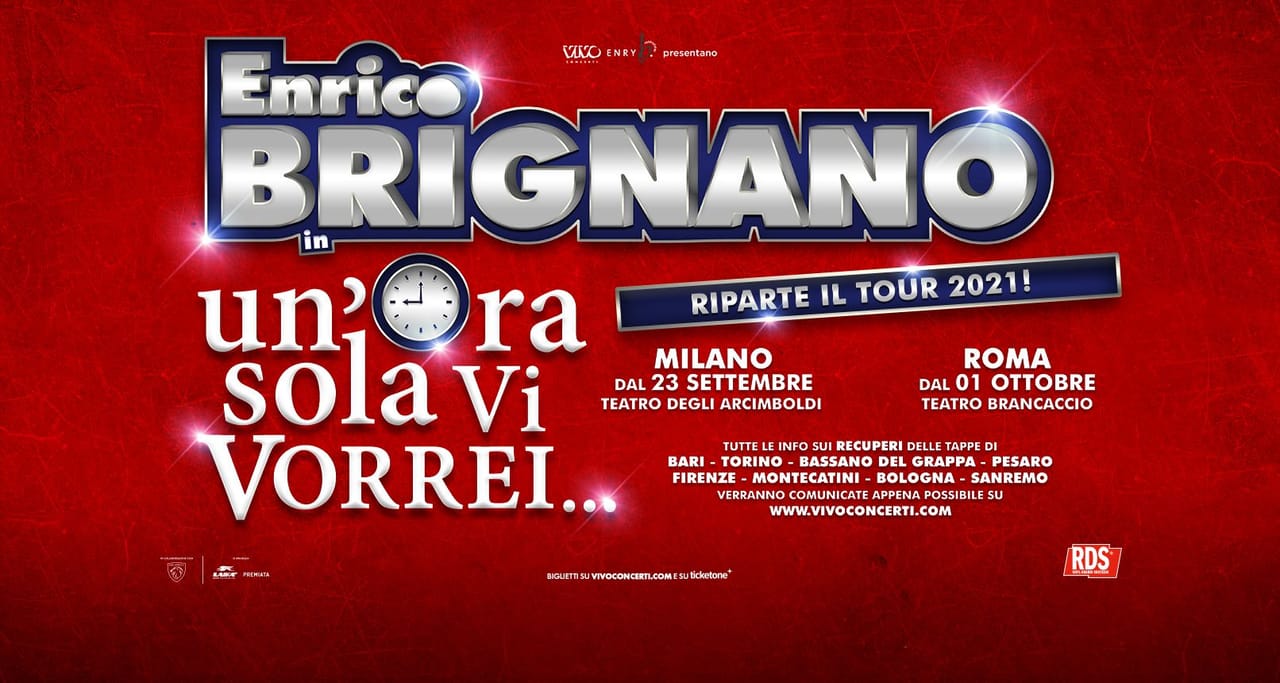 Prodotto e distribuito da Vivo Concerti, lo show fa parte di una lunga tournée che porterà il comico in tutta Italia. Enrico Brignano si esibirà nella formula del doppio spettacolo (pomeridiano e serale) unica soluzione per poter assicurare al pubblico di assistere alla replica che attendono da tempo, facendolo in totale sicurezza e nel rispetto delle normative attuali in merito alle capienze dei teatri. Per ottenere un nuovo segnaposto per lo show desiderato, sarà possibile registrare il proprio biglietto, di cui si è già in possesso, sul sito del servizio CLAPPIT e procedere così con la scelta tra lo spettacolo pomeridiano o serale della data di riferimento. Tale procedura di ri-assegnazione posti deve essere richiesta per tutti i biglietti. Ci scusiamo per questo piccolo inconveniente ma è l’unico modo che abbiamo per rispettare il patto stretto con il pubblico che con fiducia ha acquistato il biglietto.