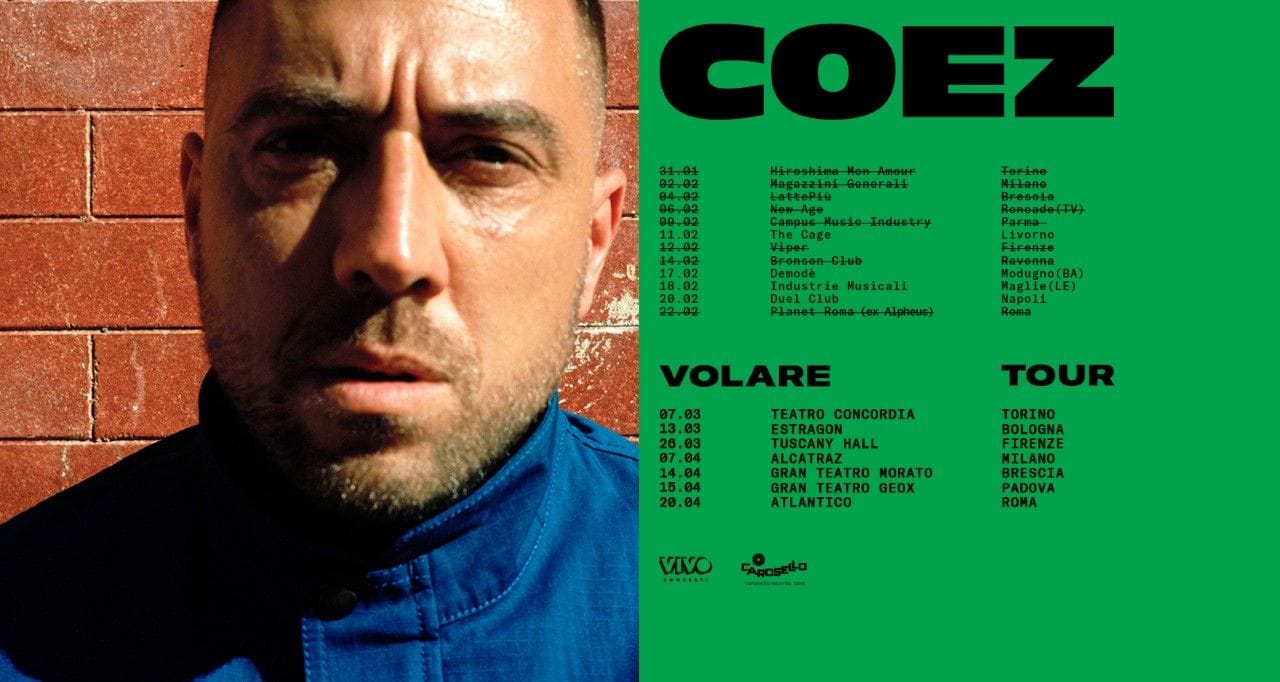 A una settimana dall’uscita del nuovo album “Volare” (Carosello Records) lo scorso 3 dicembre, Coez svela delle nuove date per il suo tour. Dopo aver annunciato 12 live nei piccoli club su cui ha trascorso i primissimi anni di gavetta agli esordi della sua carriera, questa volta il cantautore aggiunge 7 nuove tappe nei club medi, pilastri della musica live in Italia. La seconda parte del tour, prodotto da Vivo Concerti, toccherà infatti le città di Torino, Bologna, Firenze, Milano, Brescia, Padova e Roma.