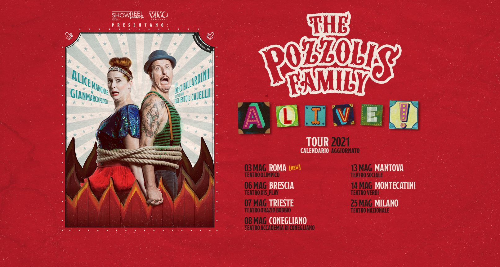 In seguito all’annuncio dello spostamento del tour della The Pozzolis Family, date le ultime disposizioni governative in contrasto al Covid-19 e il perdurare dello Stato d’Emergenza dovuto alla situazione pandemica che sta interessando l’Italia e il resto del mondo, anche il live previsto a Roma di "A-LIVE! PERCHÉ SOPRAVVIVERE AI FIGLI È UNA COSA DA RIDERE!” verrà recuperato nel 2021. La The Pozzolis Family riprenderà il tour, prodotto da Vivo Concerti e Show Reel Factory, nel mese di maggio del prossimo anno, partendo lunedì 3 dal Teatro Olimpico di Roma (nuova data). Proseguirà giovedì 6 a Brescia, presso il Dis_Play, a Trieste, venerdì 7, presso il Teatro Orazio Bobbio e giungerà a Conegliano, sabato 8 presso il Teatro Accademia di Conegliano. Il viaggio di Alice e Gianmarco continuerà poi a Mantova, giovedì 13, al Teatro Sociale, a Montecatini, presso il Teatro Verdi, venerdì 14 e si concluderà a Milano, martedì 25, presso il Teatro Nazionale. Maggiori informazioni sono disponibili su www.vivoconcerti.com.