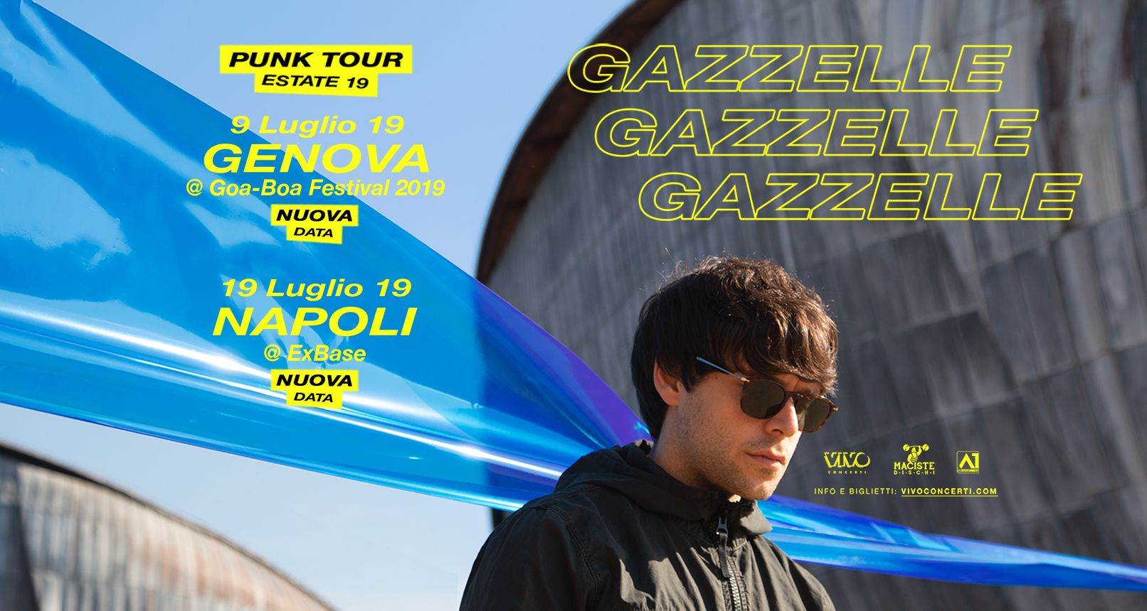 Continua inarrestabile il successo di GAZZELLE, il giovane artista romano che, dopo aver registrato il tutto esaurito nel suo tour nei principali club d’Italia e i sold out nei palazzetti di Roma e Milano, aggiunge due nuove date estive al suo prossimo “PUNK TOUR – ESTATE ‘19”. Ai live già annunciati, infatti, si uniscono i concerti di Genova (09.07), al Goa-Boa Festival (c/o Arena del Mare – Porto Antico) e a Napoli (19.07) all’ExBase.