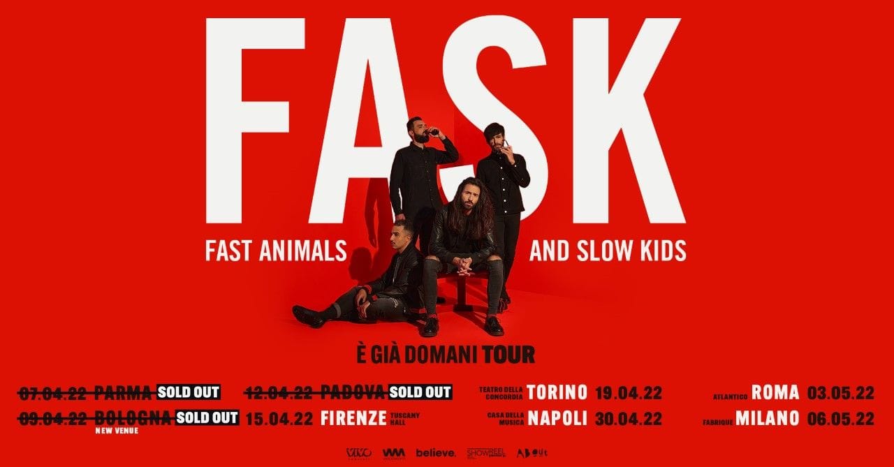 A pochi giorni dall’inizio dell’È GIÀ DOMANI TOUR i FAST ANIMALS AND SLOW KIDS annunciano che oltre a PADOVA e BOLOGNA (concerto spostato nella nuova location dell’Estragon) anche il concerto in programma giovedì 7 aprile a Parma è SOLD OUT.
