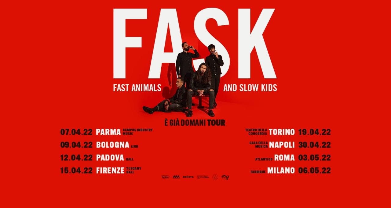 Il tour “È GIÀ DOMANI TOUR” in programma per il 2022 riporterà finalmente la band alla sua condizione ottimale: palchi, sudore, stage diving, tanto rock and roll e l’urlo liberatorio che non manca mai durante i concerti “SIAMO I FAST ANIMALS AND SLOW KIDS E VENIAMO DA PERUGIA”.