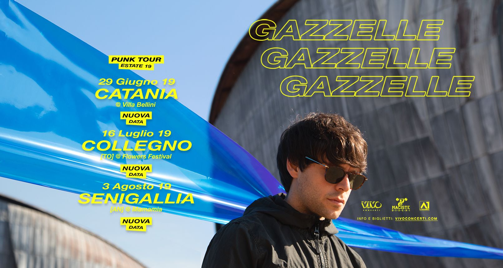 Continua inarrestabile il successo di pubblico per GAZZELLE, il giovane artista romano che, dopo aver collezionato diversi sold out, tra cui quelli nei palazzetti di Roma e Milano, annuncia due nuovi appuntamenti estivi per il suo prossimo “PUNK TOUR – ESTATE ‘19”. Alle date di Roma, Bologna e Senigallia, si aggiungono, infatti, i concerti di Catania, sabato 29 giugno 2019 a Villa Bellini e Collegno, martedì 16 luglio 2019 al Flowers Festival (c/o Parco della Certosa).