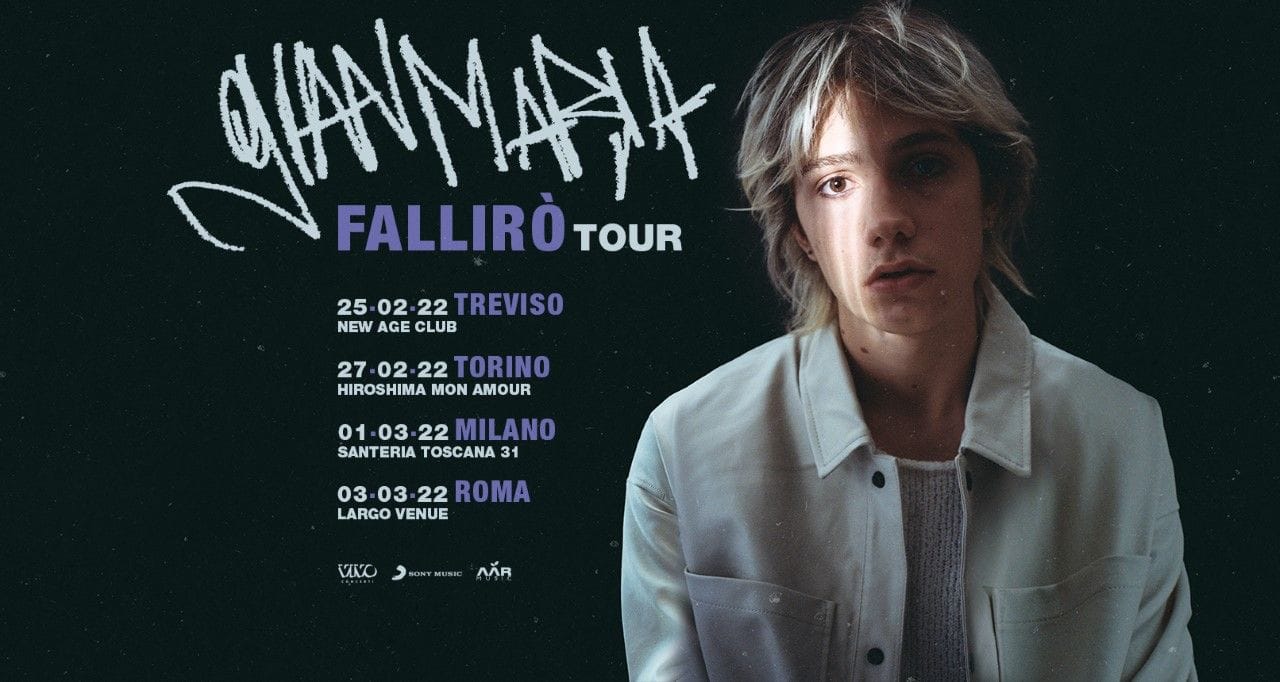 Vivo Concerti dà il benvenuto a gIANMARIA e annuncia “Fallirò Tour 2022” il primo tour del finalista di X-Factor 2021 che partirà nell'inverno 2022 da Treviso (New Age Club, 25 febbraio), toccando poi Torino (Hiroshima Mon Amour, 27 febbraio), Milano (Santeria Toscana, 1° marzo) e Roma (Largo Venue, 3 marzo).