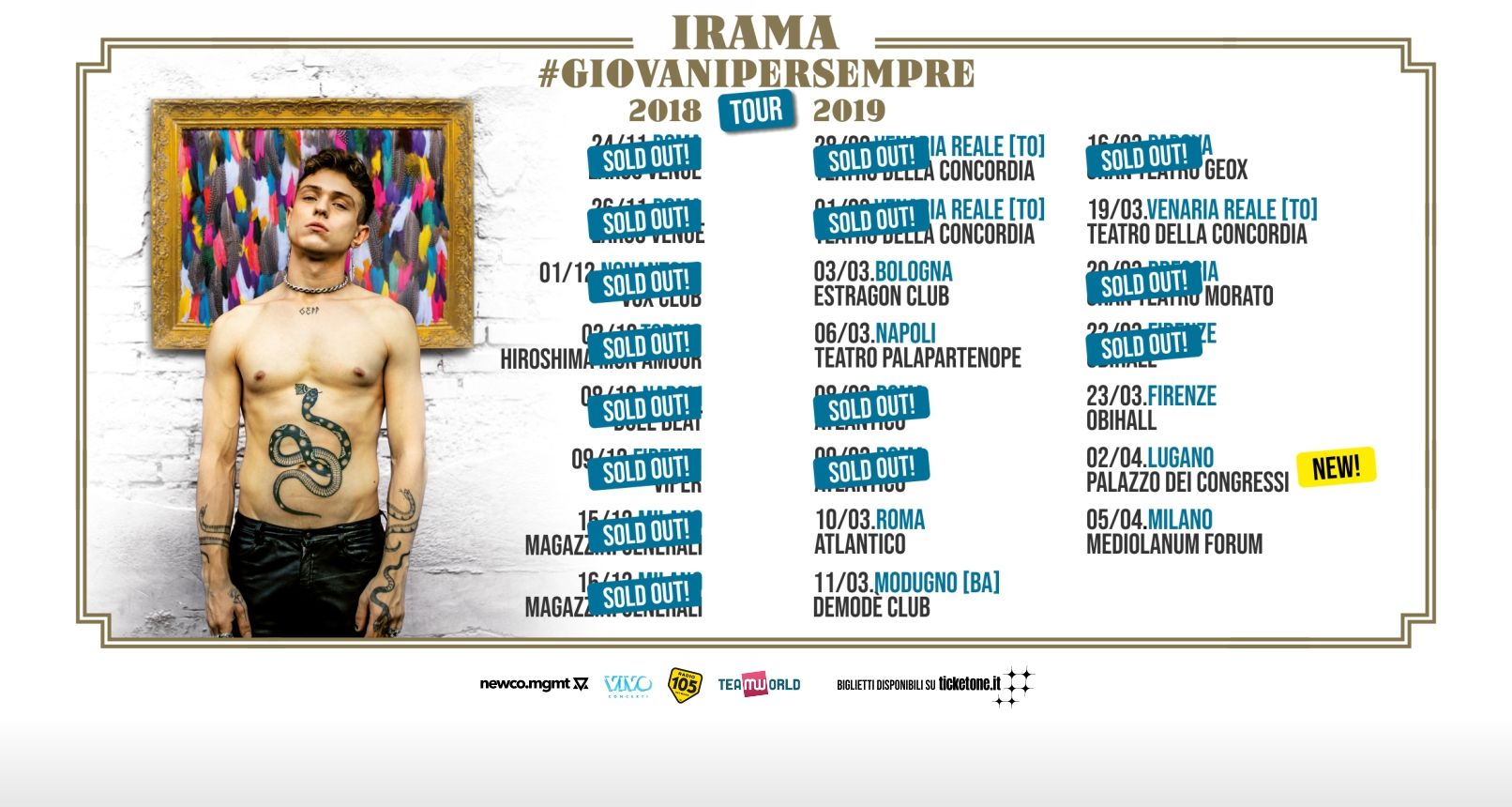 Continua senza sosta il successo di IRAMA, il giovane cantautore che, dopo l’annuncio dell’incredibile live al Mediolanum Forum di Milanoprevisto per venerdì25 aprile 2019, aggiunge un nuovo appuntamento in Svizzera al suo “#giovanipersempre Tour”, che arriverà al Palazzo dei Congressi di Lugano martedì 2 aprile 2019.