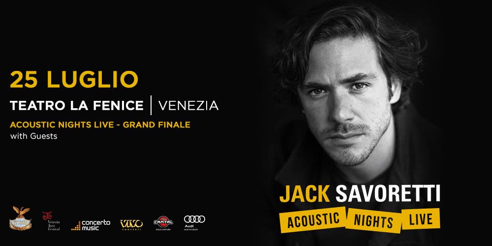 Dopo l’enorme successo delle Acoustic Nights, che hanno visto JACK SAVORETTI protagonista nei più bei teatri d’Italia, si aggiunge una data il 25 luglio 2018 al leggendario Teatro La Fenice di Venezia. Il tour, con cui l’artista si esibisce sui palchi di prestigiosi teatri italiani ed europei accompagnato dalla sezione d’archi di Paolo Conte, ha debuttato il 15 aprile nella straordinaria cornice del Teatro Ponchielli di Cremona e farà tappa il 22 maggio a Bologna all’Auditorium Manzoni, il 25 maggio al Teatro Verdi di Firenze, il 26 maggio al Teatro Regio di Parma e il 28 maggio a Verona al Teatro Filarmonico, prima di arrivare a Venezia.