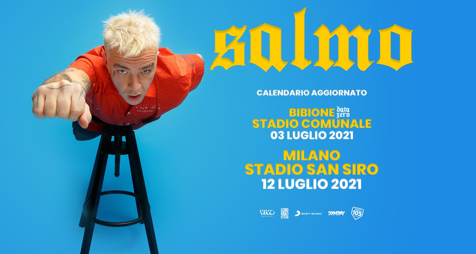 La data evento di SALMO allo stadio San Siro di Milano, prodotta e organizzata da Vivo Concerti, è riprogrammata per lunedì 12 luglio 2021. L’attesissimo live del fuoriclasse del rap italiano sarà preceduto dalla data zero, prevista nuovamente per sabato 3 luglio 2021 allo Stadio Comunale di Bibione (VE).