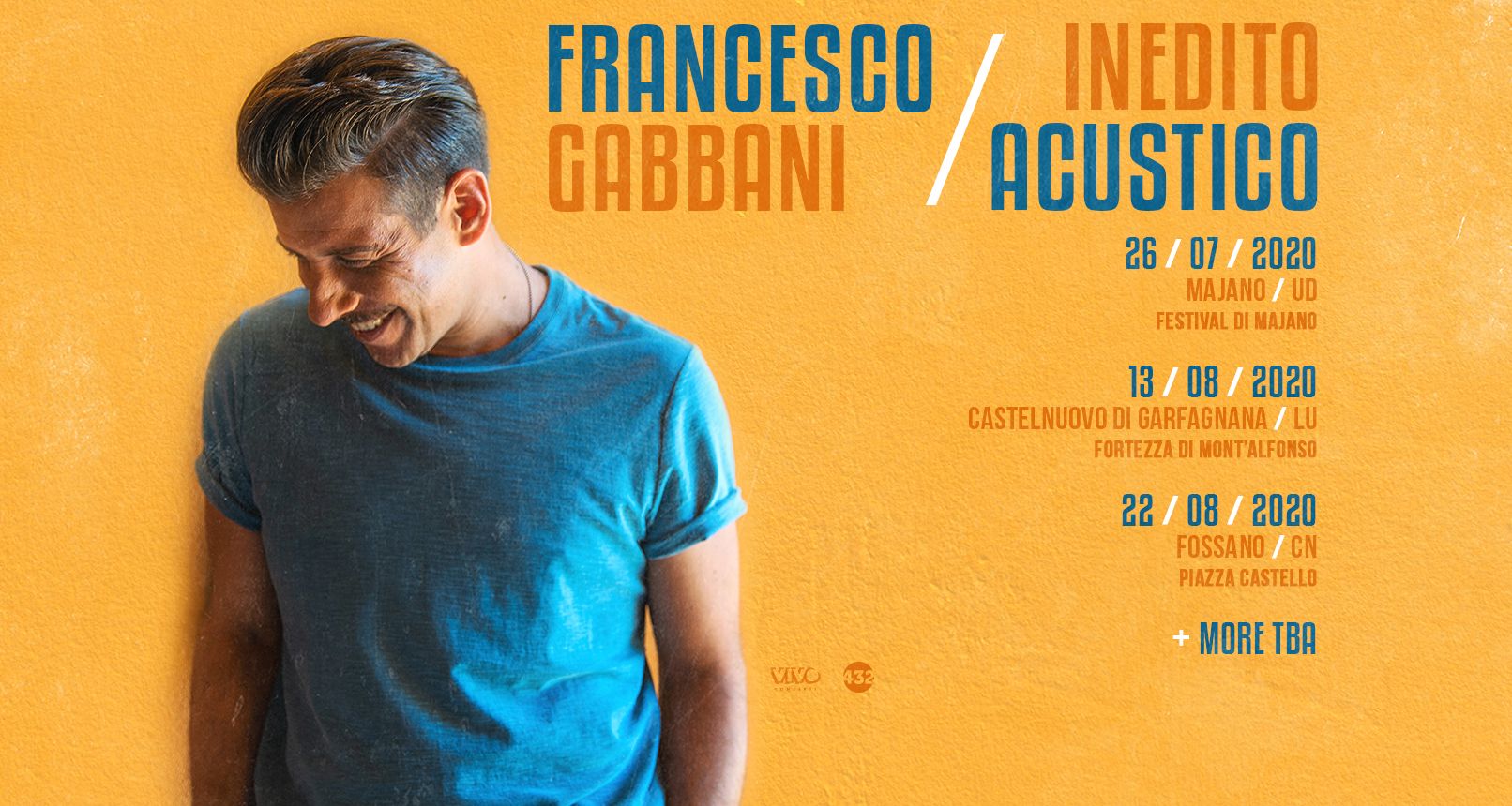 Francesco Gabbani annuncia oggi le prime tre date di un tour studiato ad hoc per questa estate 2020, per poter tornare finalmente dal vivo e poter ritrovare, più da vicino, i suoi sostenitori. Un tour che Gabbani ha fortemente voluto per lanciare un segnale di speranza per un settore -quello dello spettacolo- in profonda sofferenza in questo periodo così difficile.