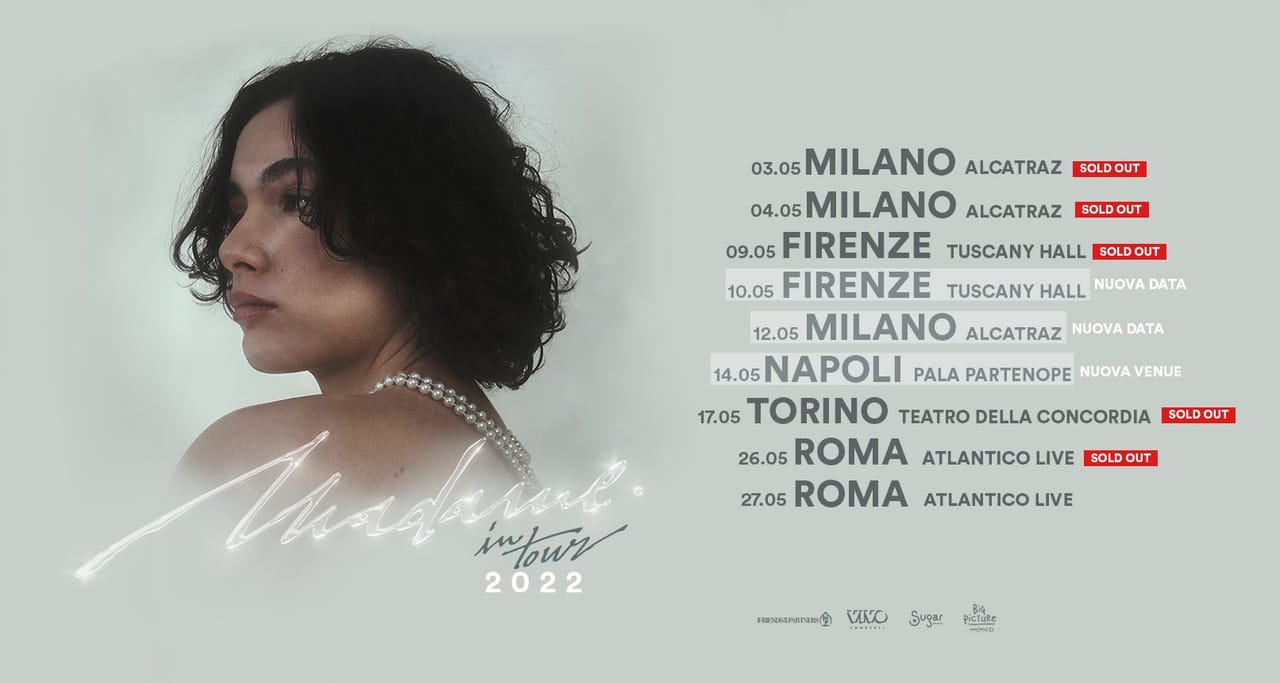Il “MADAME IN TOUR”, prodotto e organizzato da Friends & Partners e Vivo Concerti in collaborazione con Big Picture Management e Sugar Music, inizialmente previsto per dicembre 2021 sarà rinviato a maggio 2022.
