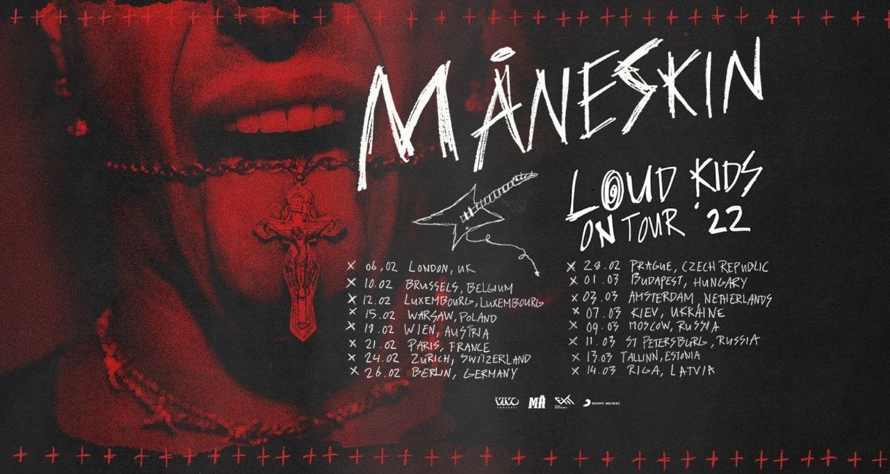 Dopo aver scalato le classifiche internazionali e calcato i palchi dei principali Festival estivi europei, i Måneskin annunciano oggi il “LOUD KIDS ON TOUR”, la tournée prevista per i mesi di febbraio e marzo 2022, che li vedrà esibirsi nelle più importanti città d’Europa.