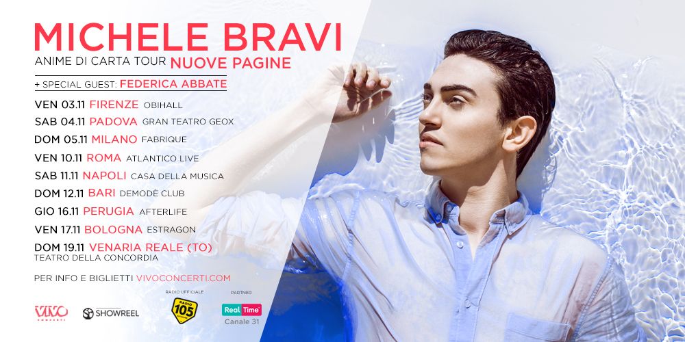 Dopo i sold out delle due anteprime a Milano e Firenze, in arrivo per l’autunno 2017 “Anime di Carta Tour – Nuove Pagine”, la prima tournée di MICHELE BRAVI, organizzata da Vivo Concerti. Michele calcherà i palchi delle più importanti città italiane: