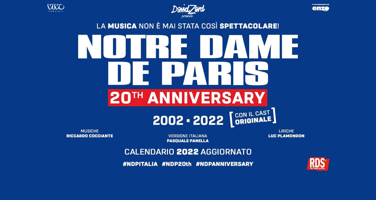 Per il tour del 2022, a vent’anni dall’esordito dell’opera sui palchi d’Italia il 14 marzo del 2002 al GranTeatro di Roma, Notre Dame de Paris avrà come protagonista l’intero cast originale del debutto.