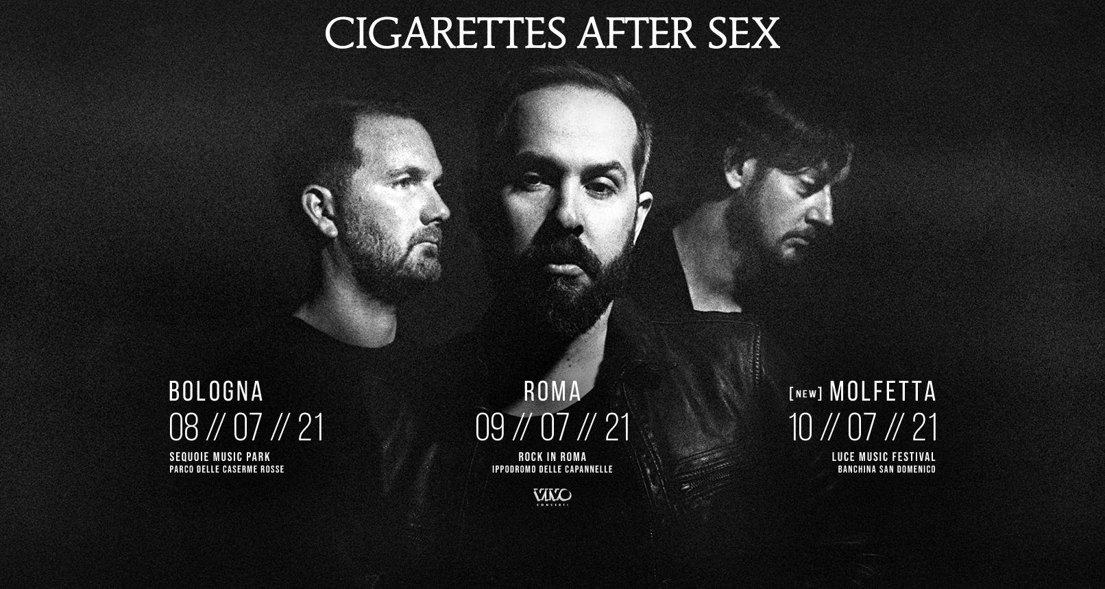 A grande richiesta si aggiunge una data estiva per I CIGARETTES AFTER SEX che, oltre ad esibirsi sui palchi del Sequoie Music Park di Bologna giovedì 8 luglio 2021 e del ROCK IN ROMA venerdì 9 luglio 2021, suoneranno per il pubblico italiano al Luce Music Festival di Molfetta – Bari sabato 10 luglio 2021. I tre live sono organizzati da Vivo Concerti.