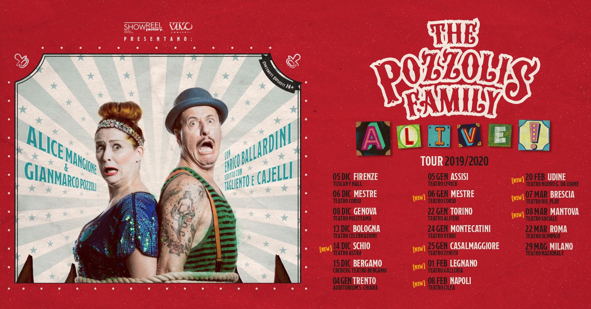 Alice Mangione e Gianmarco Pozzoli della THE POZZOLIS FAMILY tornano insieme sul palco con la nuova edizione del loro dissacrante spettacolo: entrate nel magico tendone della The Pozzolis Family, per vivere l’esperienza familiare più liberatoria e straordinaria di sempre: Perché il circo? Beh, scusate, ma cosa c’è di più circense di un genitore? Equilibristi! Che riescono a sopravvivere tra maternità e lavoro. Fantasisti! Quando si tratta di inventarsi una cena alle otto di sera e non si è fatta la spesa. Contorsionisti! Nel letto, cercando posizioni plausibili per “riposare” mentre quei piccoli angioletti ti sfracellano la schiena con le ginocchia. Clown! Per far divertire i bambini e ridere di noi stessi, ma soprattutto… Domatori! Perché ogni tanto, metterli in gabbia sarebb… ah, non si può? “A-LIVE! PERCHÉ SOPRAVVIVERE AI FIGLI È UNA COSA DA RIDERE!” è un grande show, prodotto da Vivo Concerti e Show Reel Factory, ricco di stand-up, canzoni, numeri di varietà e riti spirituali, che permetterà al pubblico di farsi trascinare da Alice e Gianmarco nel “mondo Pozzolis” ed essere parte attiva della performance. Un’esperienza catartica e soprattutto confortante, perché chi ha figli si sentirà compreso, mentre chi non li ha potrà esclamare: “meno male!”
