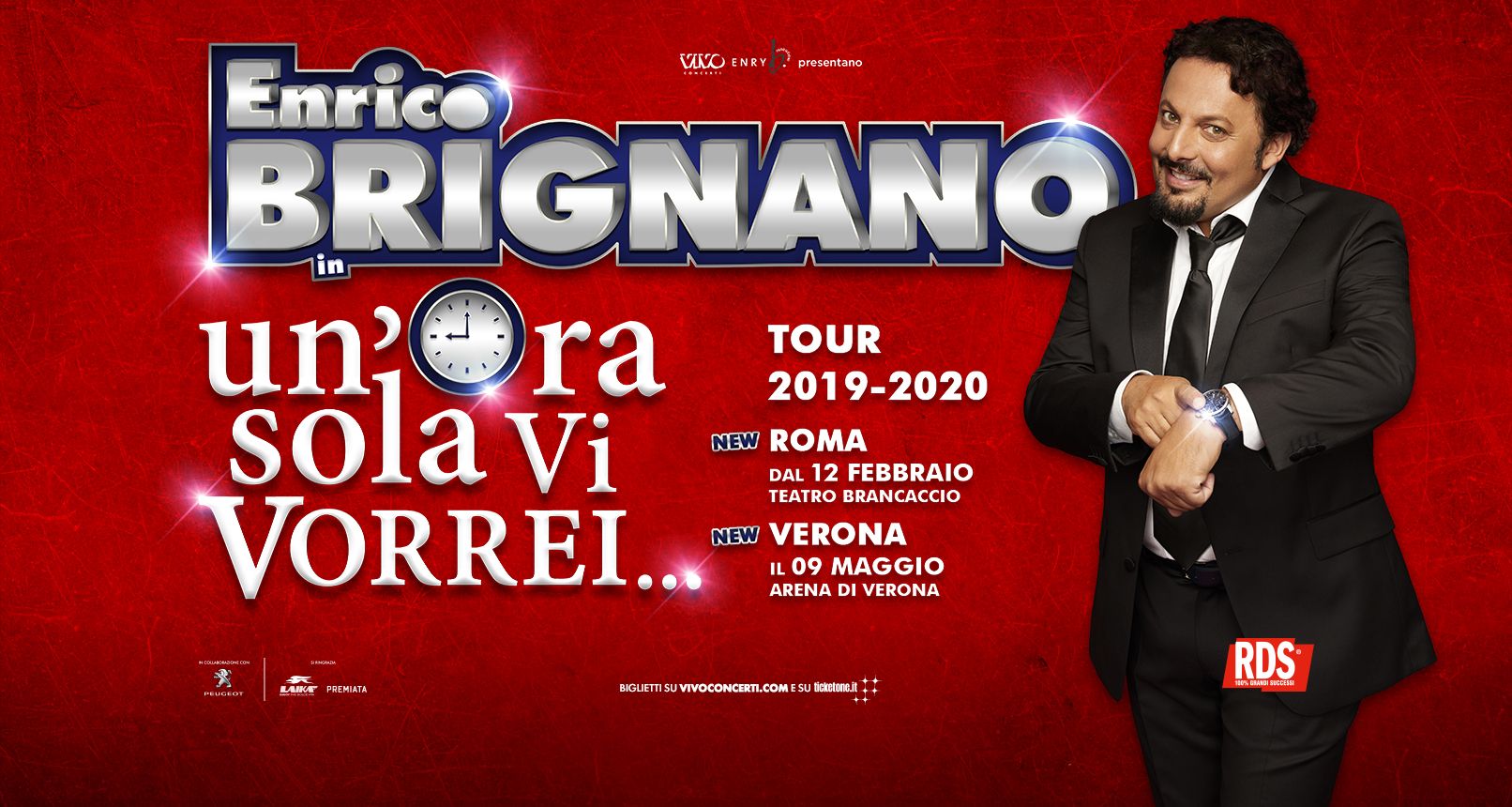 Grande successo per lo spettacolo teatrale “Un’ora sola vi vorrei”, prodotto e distribuito da Vivo Concerti. Il nuovo one-man show di ENRICO BRIGNANO aggiunge quindici nuove repliche al Teatro Brancaccio di Roma e un’imperdibile data all’ARENA DI VERONA prevista per sabato 9 maggio 2020.