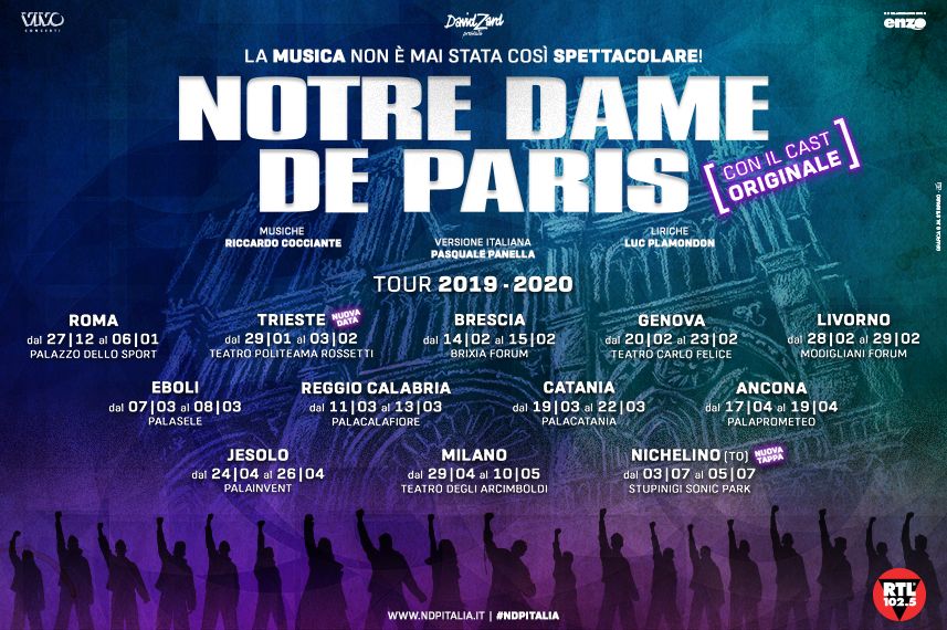 NOTRE DAME DE PARIS debuttava nella sua versione originale francese il 16 settembre 1998, al Palais des Congrès di Parigi, dove fu subito trionfo. Quattro anni dopo, David Zard produceva la versione italiana con l’adattamento di Pasquale Panella. Il 14 marzo 2002, al Gran Teatro di Roma, costruito per l’occasione, si teneva la “prima” di quello che sarebbe stato l’opera dei record, un’emozione che, da allora, ha “contagiato” milioni di spettatori. Un successo travolgente che ha raggiunto non solo il pubblico di Francia e Italia, ma quello di tutto il mondo: Inghilterra, Svizzera, Russia, Canada, fino a Cina, Giappone, Corea del Sud, Libano, Turchia, insieme a decine di altri paesi, riscuotendo ovunque un numero di presenze senza precedenti.
