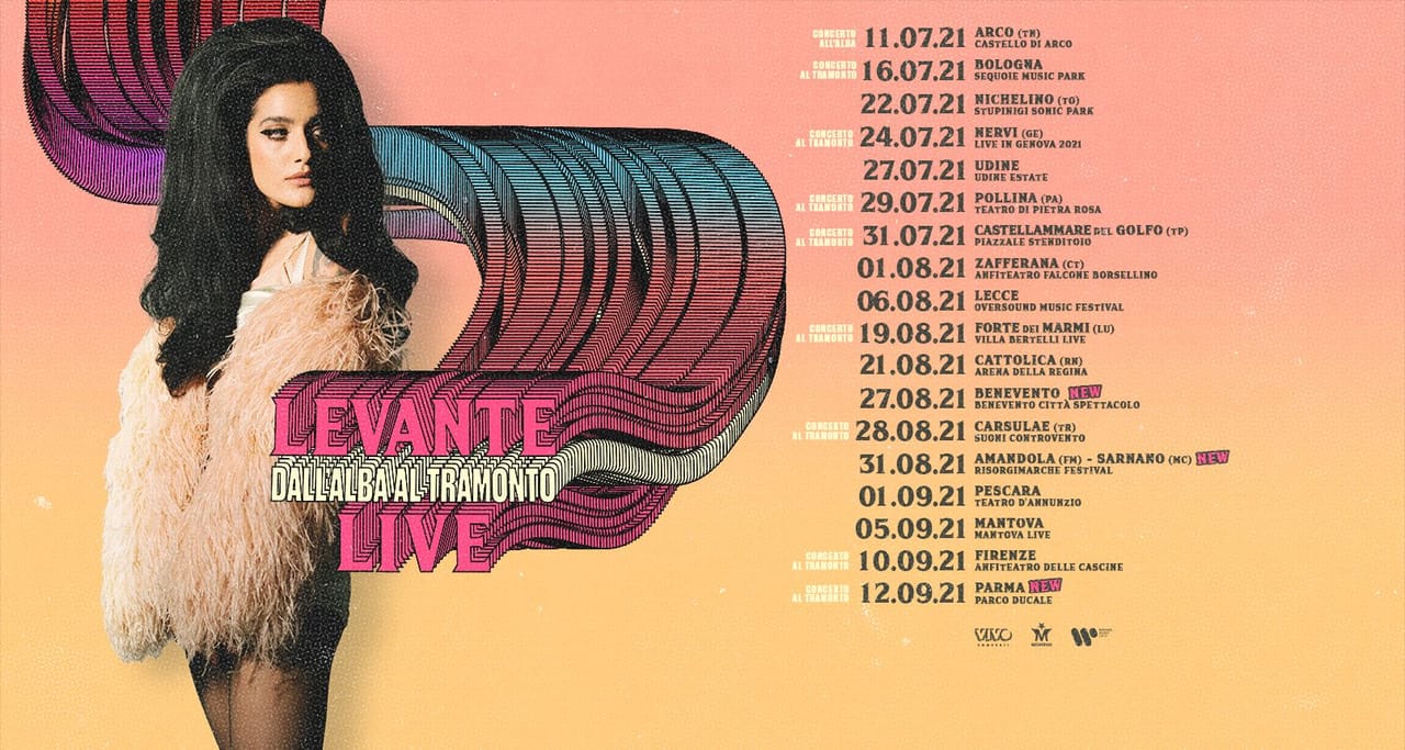 In armonia con la sua recente riflessione sul senso della fine e dell’inizio, espresso anche nel brano “Dall’Alba al Tramonto”, Levante ha dato inizio alla tournée estiva con una data all’alba ad Arco (TN) (Castello di Arco, 11 luglio), in cui ha condiviso con il suo pubblico un momento magico riportando la sua musica live per la prima volta simbolicamente al sorgere del sole. Le date comunicate oggi toccheranno: Benevento (Piazza Castello - Benevento Città Spettacolo, 27 agosto), Amandola (FM) (Sarnano (MC) Località Fontanelle - RisorgiMarche Festival, 31 agosto) e Parma (Parco Ducale, 12 settembre) per un suggestivo concerto al tramonto.