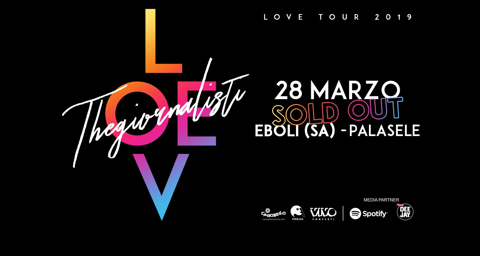 A più di un mese di distanza dall’inizio del nuovo tour primaverile i Thegiornalisti registrano il tutto esauritoanche per la tappa al Palasele di Eboli prevista pergiovedì 28 marzo 2019.La tranche primaverile del “LOVE Tour 2019” partirà il 26 marzo da Jesolo, un nuovo tour nei palazzetti che ha già registrato il sold out su 8 tappe.