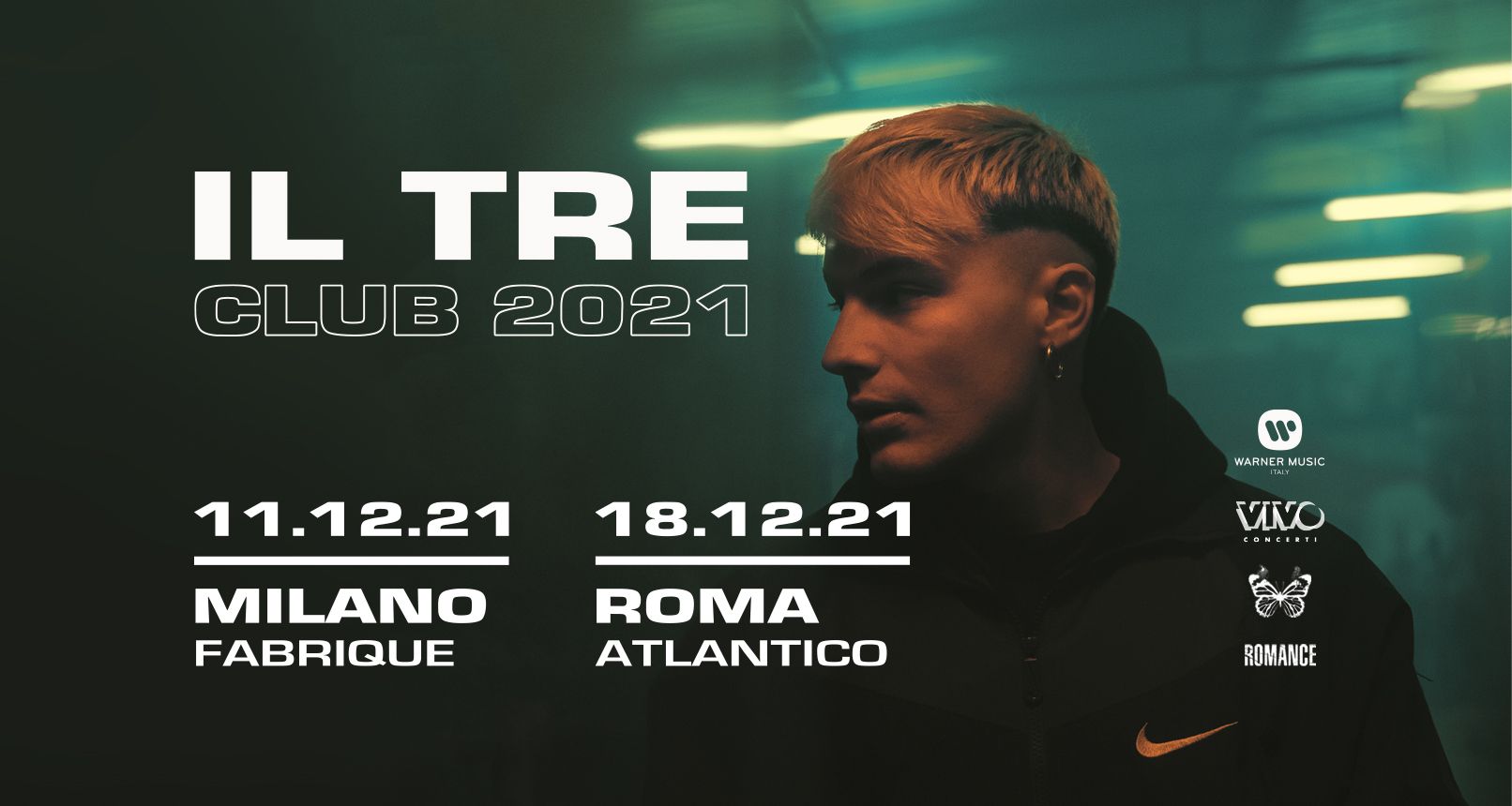 Dopo il successo di “Te lo Prometto”, certificato Platino per le vendite e tra i brani più popolari di Tik Tok, e dopo la pubblicazione di un nuovo singolo “Pioggia” subito nella top10 di Spotify e con un video in tendenza su YouTube, Il TRE fa un’altra sorpresa ai suoi fan annunciando due date del suo Tour Club 2021, prodotte e distribuite da Vivo Concerti.