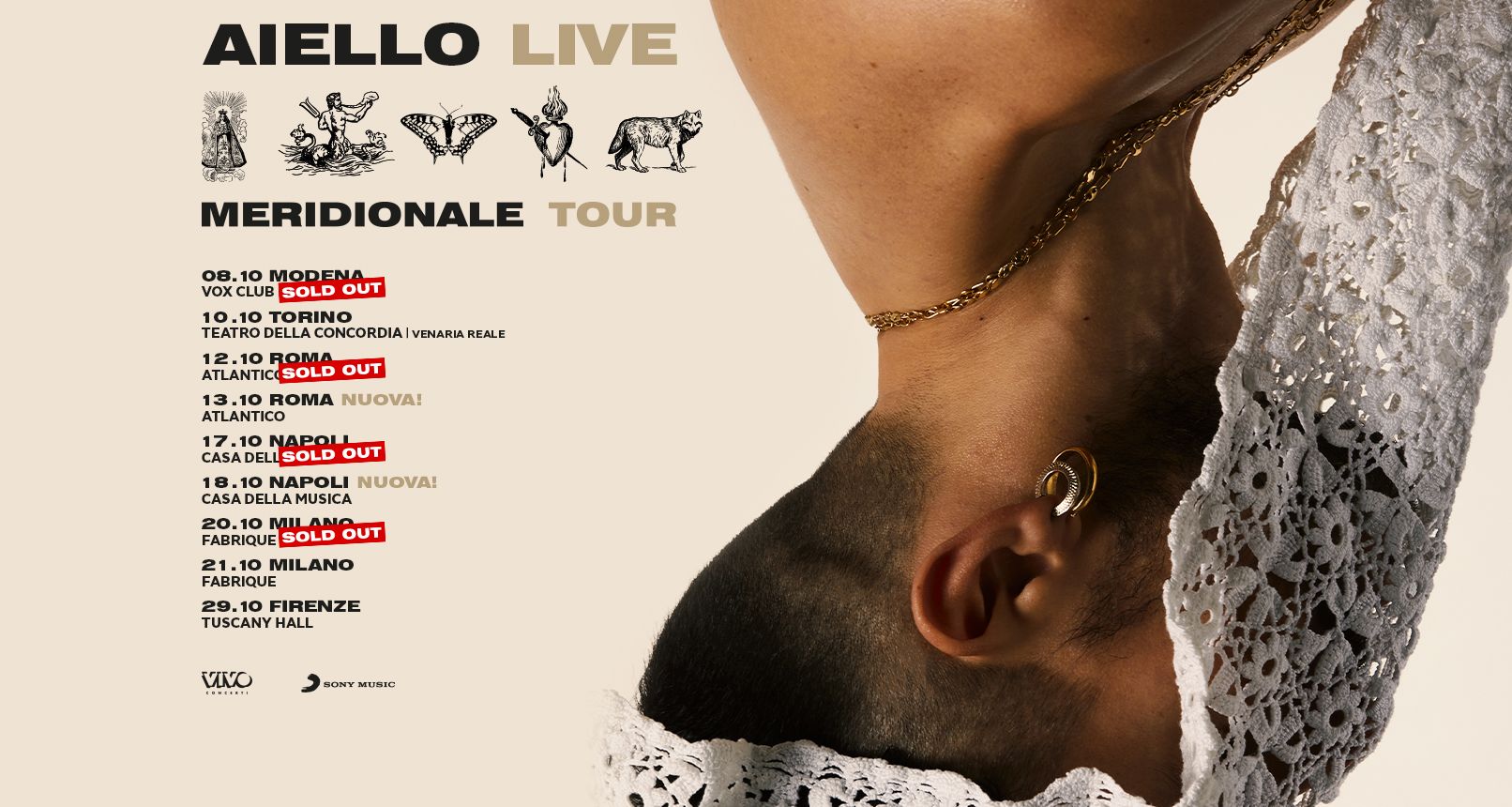 Durante i live, AIELLO presenterà le canzoni contenute nel nuovo album “MERIDIONALE”, in uscita il 12 marzo e già disponibile in presave e preorder, tra cui i singoli che lo hanno anticipato, “VIENIMI (a ballare)” (disco d’oro), “CHE CANZONE SIAMO” e “ORA”, brano con il quale calcherà il palco del Teatro Ariston. Non mancheranno poi i suoi successi più acclamati, come “ARSENICO” (disco di platino) e “LA MIA ULTIMA STORIA” (disco d’oro).