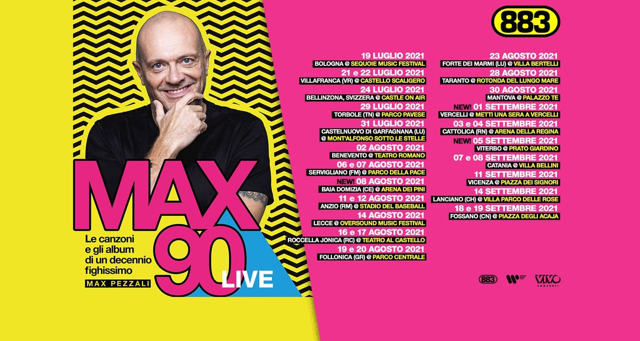 Si aggiunge una nuova data al Max90 Live, il tour prodotto e distribuito da Vivo Concerti che ripercorre i grandi successi degli anni novanta di Max Pezzali. La tournée toccherà infatti anche Caserta (Real Belvedere di San Leucio) il 15 settembre 2021.