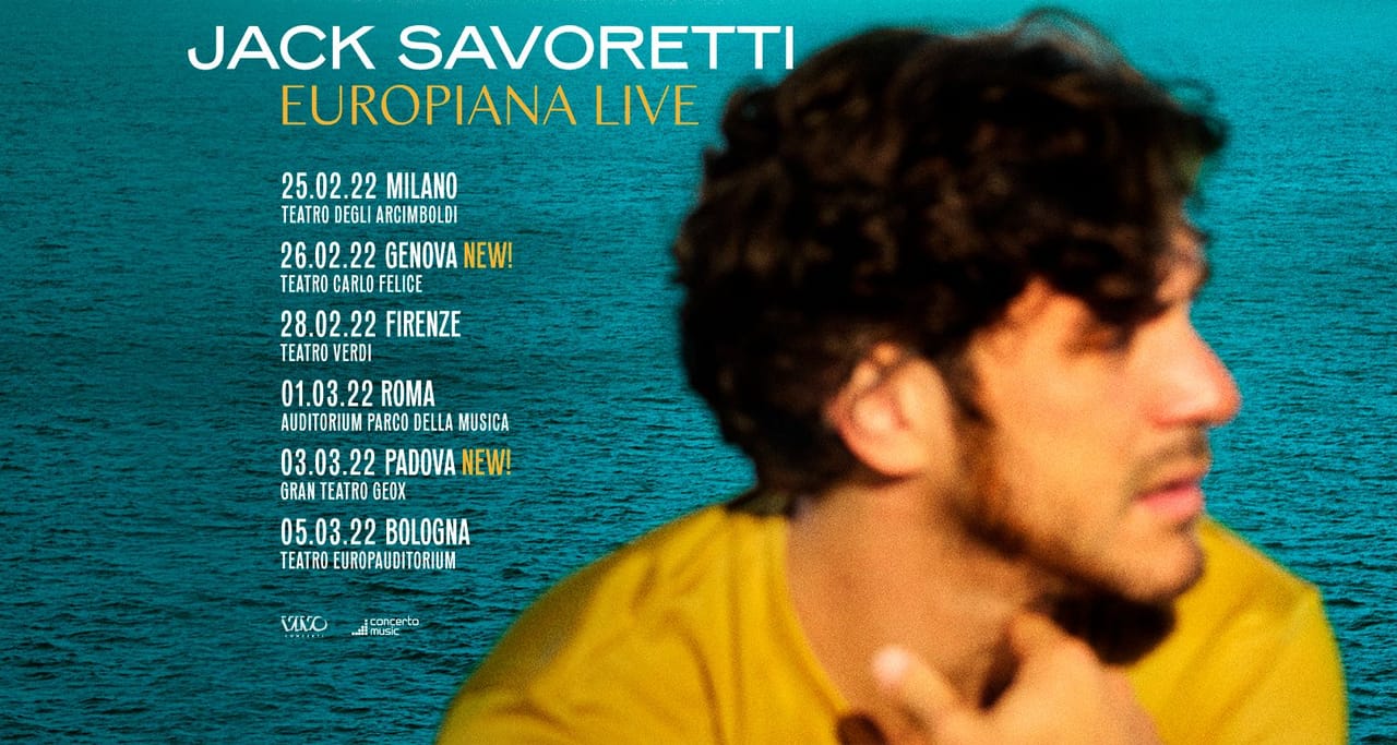 Jack Savoretti annuncia oggi due nuove date in Italia! Il tour toccherà sabato 26 Febbraio 2022 il Teatro Carlo Felice di Genova e giovedì 3 Marzo 2022 il Gran Teatro Geox di Padova. L’artista è pronto a tornare live toccando tutta Europa per presentare il suo nuovo album “Europiana” (EMI Records / Polydor X Universal Music).