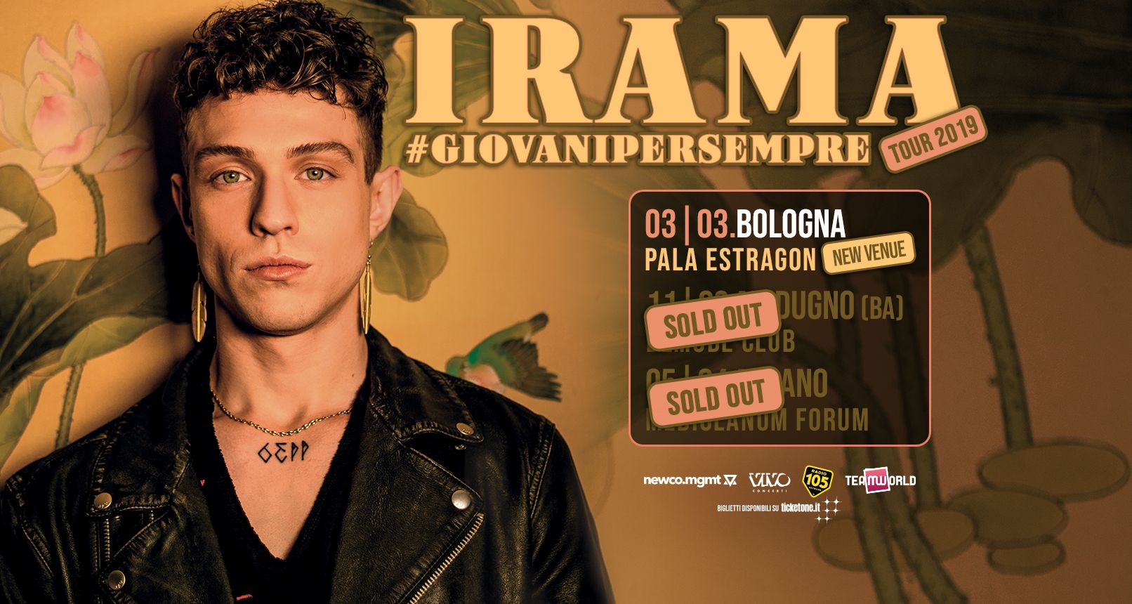 Continua senza sosta il successo di IRAMA, il giovane cantautore che registra il sold out dell’incredibile live al Mediolanum Forum di Milanoprevisto per venerdì 5 aprile 2019. Biglietti esauriti anche per la tappa di lunedì 11 marzo a Modugno (BA) al Demodè Club. Nel frattempo, la data di Bologna (domenica 3 marzo) si sposta dall’Estragon Club in una venue più grande, il PalaEstragon.
