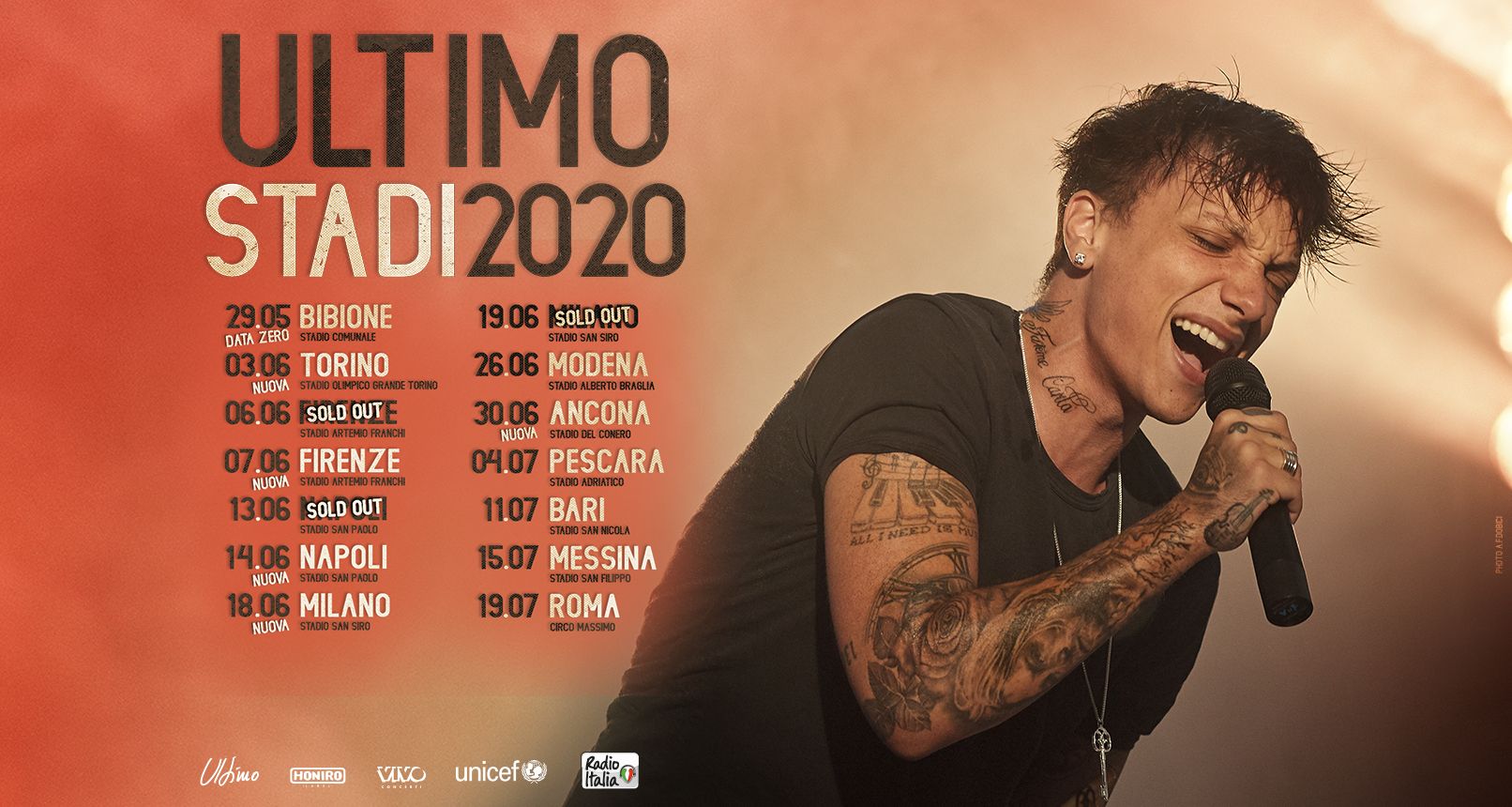 Un successo di pubblico senza precedenti quello di Ultimo, il cantautore romano che, dopo aver registrato con mesi d’anticipo il tutto esaurito negli stadi di Firenze e Milano, a cui si aggiunge oggi il sold out al San Paolo di Napoli (13 giugno 2020), annuncia sei nuove date del suo TOUR NEGLI STADI2020.