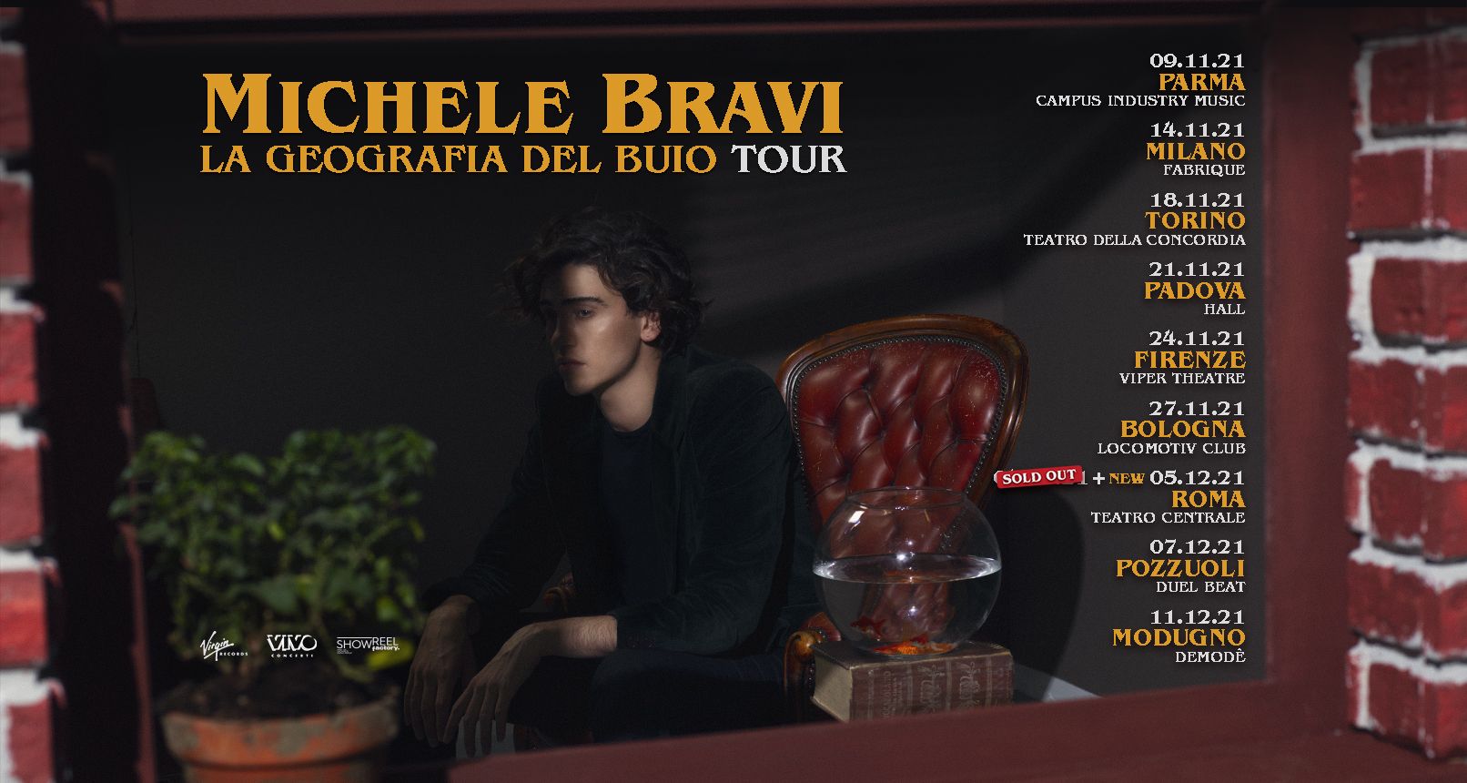 Grande successo per “La Geografia del Buio Tour”, la nuova avventura live di Michele Bravi prodotta da Vivo Concerti, che partirà da Parma, martedì 9 novembre 2021, presso il Campus Industry Music e terminerà sabato 11 dicembre a Modugno al Demodè.