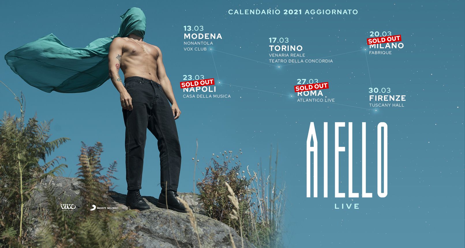 Mercoledì 5 agosto 2020. A causa del prolungarsi dello stato di incertezza sull’evolversi della situazione degli spettacoli live dovuto all’emergenza Covid-19, il tour di AIELLO, prodotto da Vivo Concerti, previsto la scorsa primavera, è stato posticipato a marzo 2021.