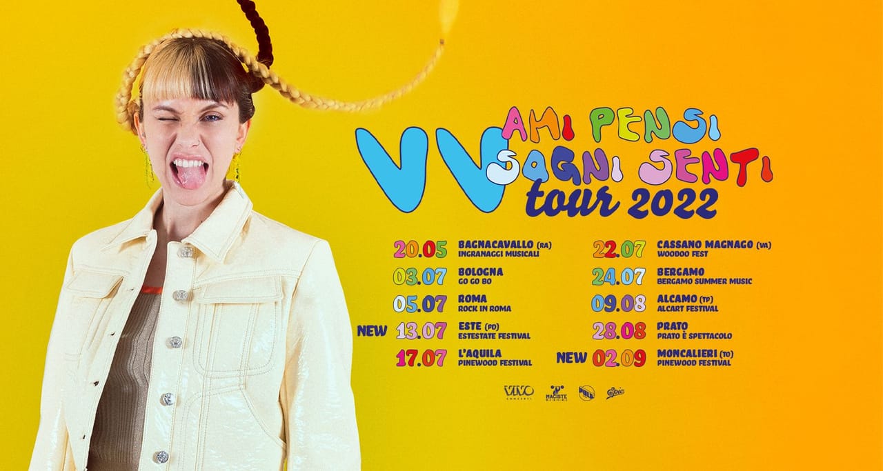 VV, all’anagrafe Viviana Colombo, talentuosa cantautrice del panorama musicale italiano emergente, aggiunge due nuove date estive di AMI PENSI SOGNI SENTI TOUR, prodotte e distribuite da Vivo Concerti: mercoledì 13 luglio a Este (PD), all’ Estestate Festival, e venerdì 2 settembre a Moncalieri (TO) al Pinewood.