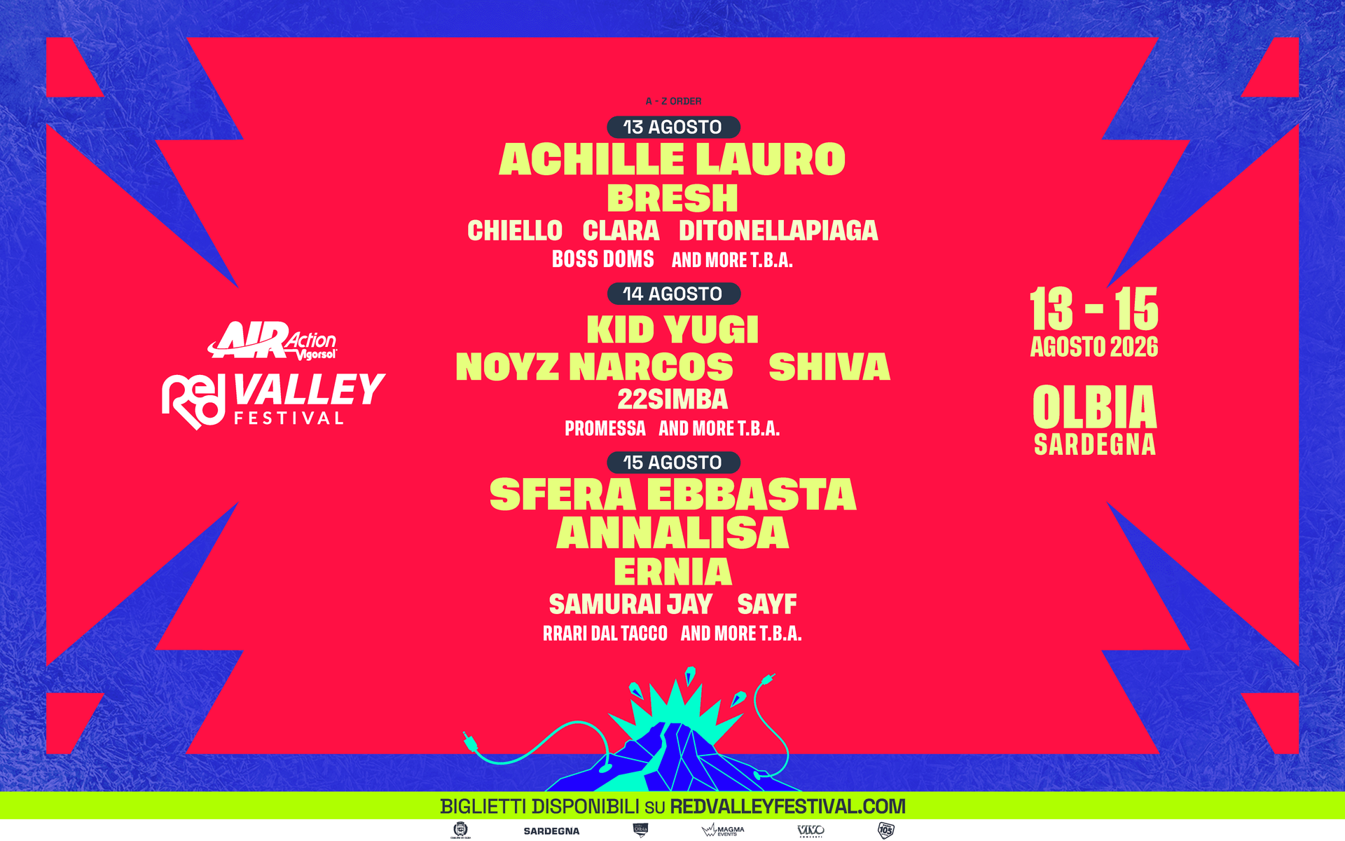 Il RED VALLEY FESTIVAL, in programma dal 13 al 15 agosto 2026 presso l’Olbia Arena, svela nuovi nomi nella lineup della sua undicesima edizione. Achille Lauro, Bresh, Chiello, Clara, Ditonellapiaga e Boss Doms per il DAY1, Shiva e 22Simba per il DAY2 e Annalisa e Sayf per il DAY3 sono i nuovi artisti che si aggiungeranno a quelli precedentemente annunciati: Ernia, Kid Yugi, Noyz Narcos, Promessa, Rrari Dal Tacco, Samurai Jay e Sfera Ebbasta.